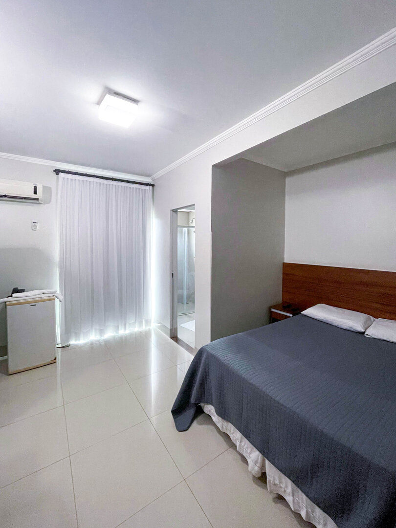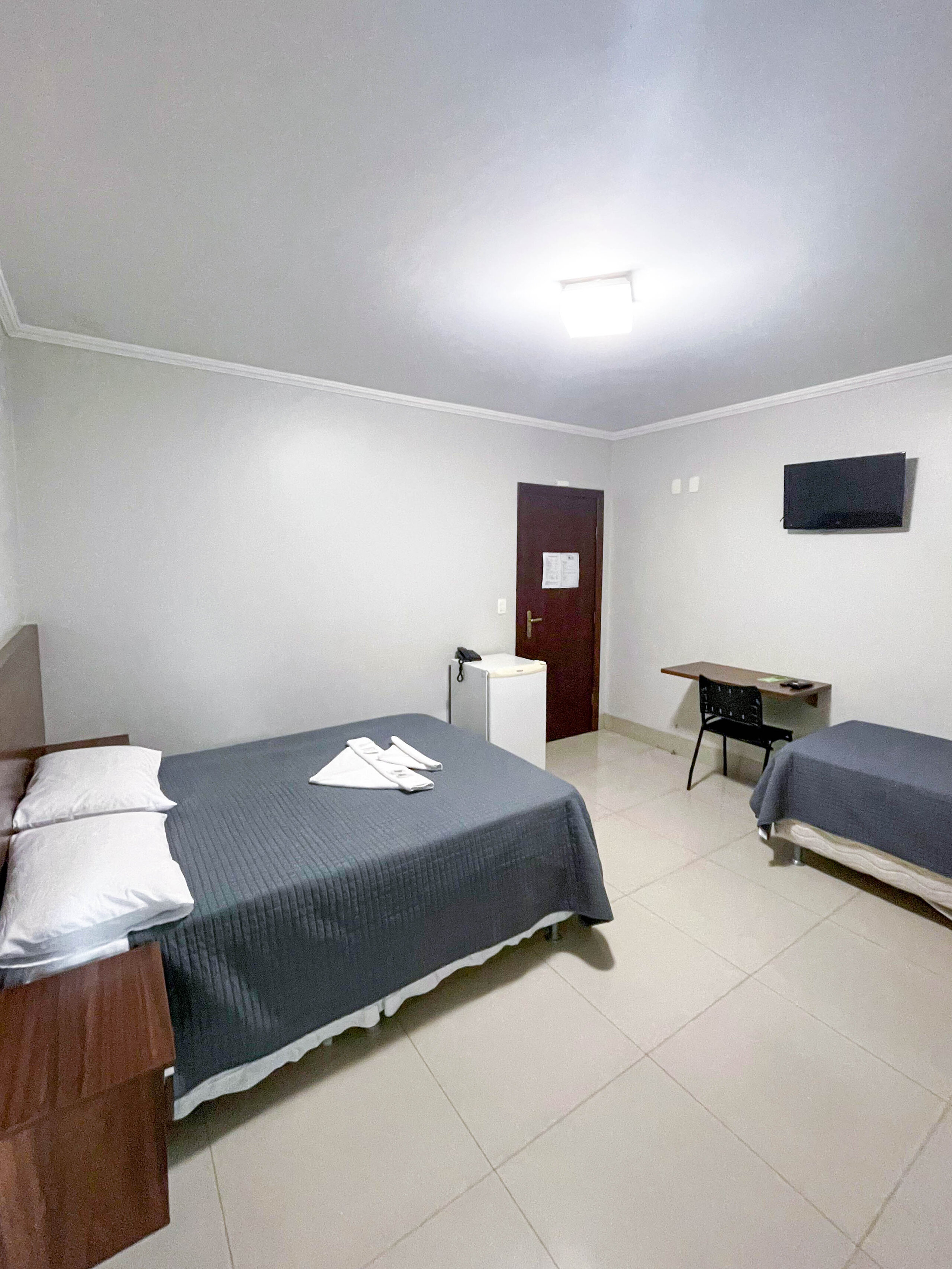 Nossos quartos no Hotel Minas são pensados para proporcionar o máximo de conforto e praticidade. Com capacidade para até 4 pessoas, todos os quartos são equipados com ar-condicionado, telefone, TV e frigobar. Seja uma viagem em família, a trabalho ou a lazer, temos o espaço ideal para você relaxar e recarregar as energias. Além disso, aceitamos pets, para que toda a família possa desfrutar de uma estadia agradável e confortável.
