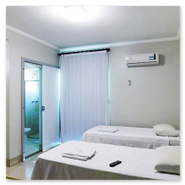 Cama de casal, duas camas de solteiro, TV, ar-condicionado, telefone, mesa, amenidades de banho (sabonete, toalhas, etc.), Wi-Fi