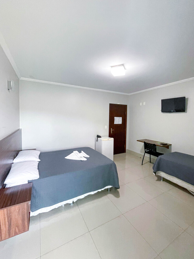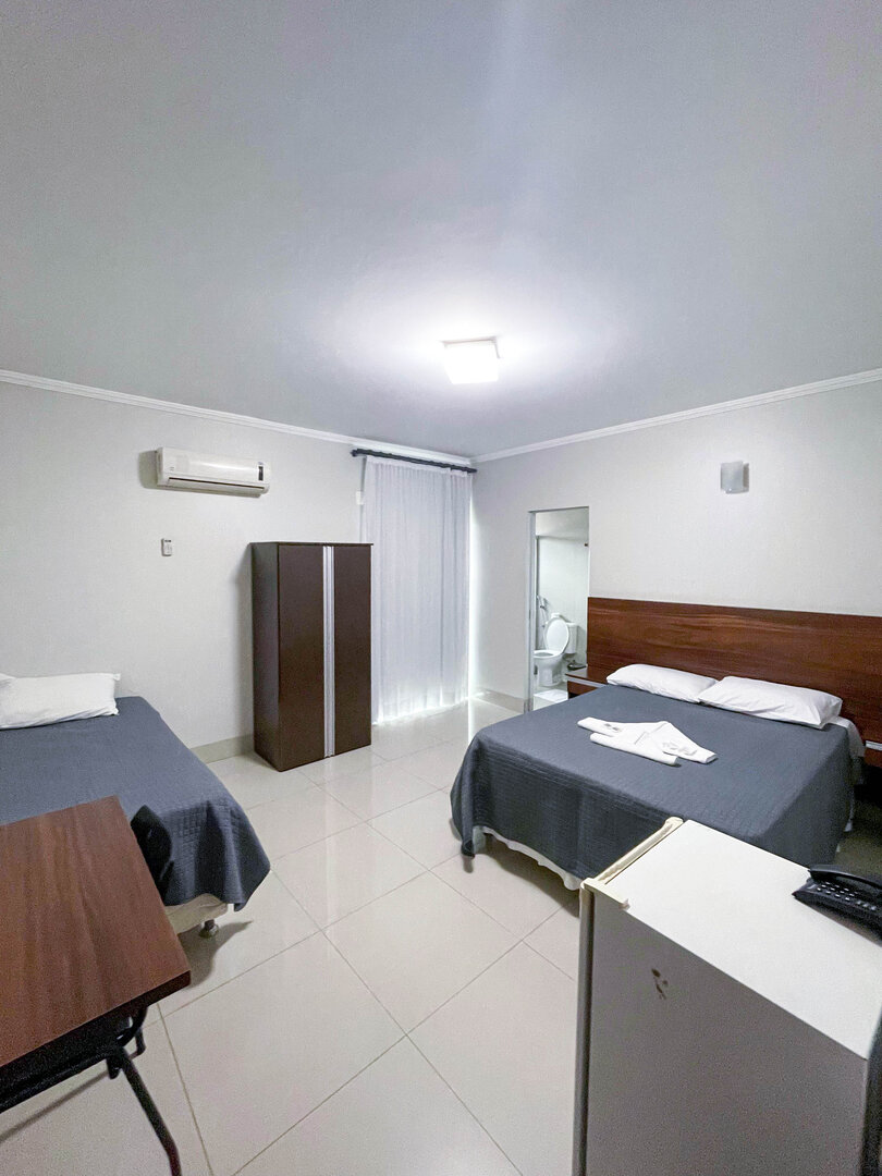 O Quarto Standard Triplo é ideal para até três hóspedes, oferecendo uma cama de casal e uma cama de solteiro. Inclui mesa, armário, televisão, frigobar, ar-condicionado, telefone e Wi-Fi gratuito. Comodidades como sabonete, shampoo e toalhas são fornecidas para maior conforto.