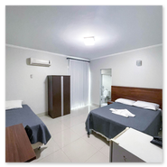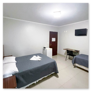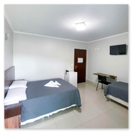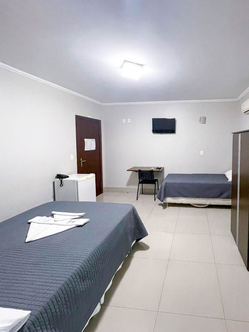 Cama de casal, cama de solteiro, mesa, armário, TV, Wi-Fi, amenidades de banho (sabonete, toalhas, etc.), frigobar, ar-condicionado, telefone